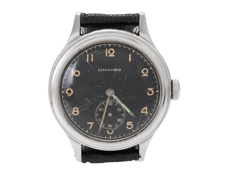 LONGINES, s.c. "Sei Tacche", men´s wristwatch, 33,5 mm, Cal 23.M, Serial no. 6614253, Case no. 22524 / 19, steel, manual winding, plastic crystal, small seconds hand, damaged hands, re-lumed hands, damaged dial, leather strap, approx. 1943.