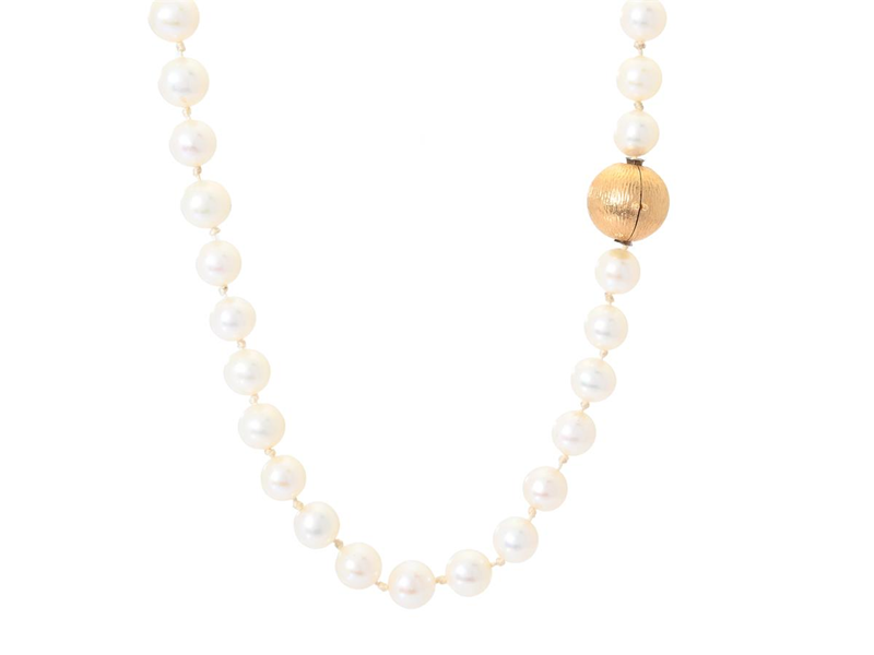 OLE LYNGGAARD, clasp, 18K gold, diameter 10,6 mm, weight 2,8 g, pearl necklace, cultured pearls approx. 6-6,8 mm, off round, length 45 cm, cap ends, ragged silk.