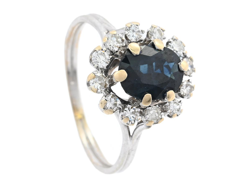 CLUSTER RING, 18K white gold, oval faceted sapphire, 12 brilliant cut diamond- and single cut diamonds approx. 0,36 ctw, size 17,25 mm, weight 3,0 g, one diamond broken, worn prongs.