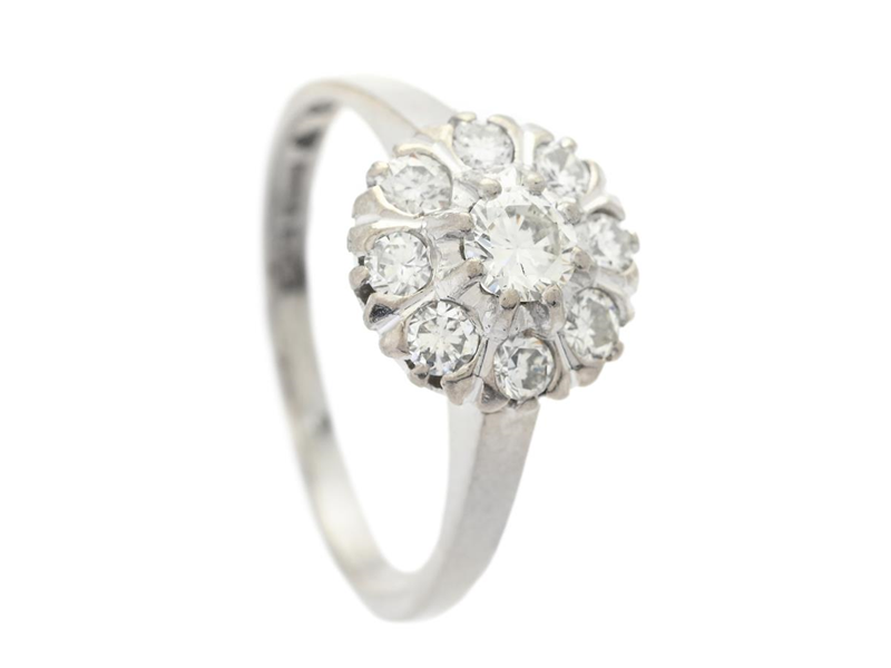 CLUSTER RING, 18K white gold, brilliant cut diamond- and swiss cut diamonds 0,65 ctw according to engraving, approx. TW-Cr/SI-P, Juvel-Magnus, Gothenburg 1967, size 17,25 mm, weight 3,7 g, altered ring size, two side stones has small damages.