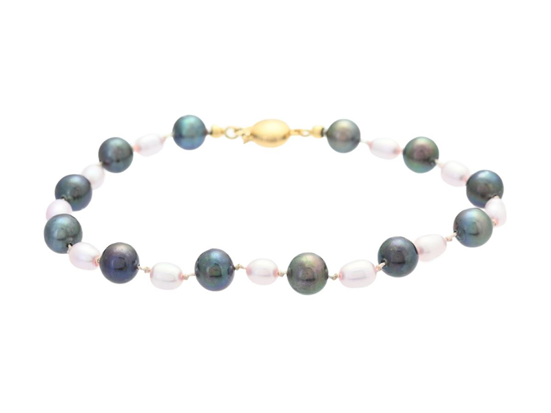 BRACELET, cultured dyed freshwater pearls, approx. 4,7-7,8 mm, knotted, clasp i 18K gold, length 20 cm