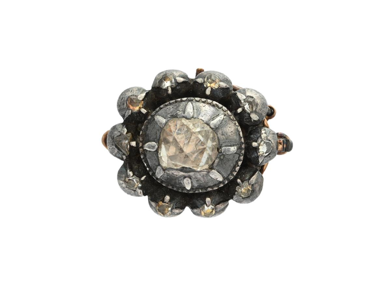 CLASP, silver/18K gold, rose cut diamonds, center stone are damaged, antique, length 15 mm, weight 4,1 g.