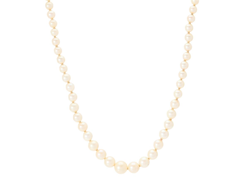 PEARL NECKLACE, cultured pearls approx. 3,5-7,2 mm, clasp in 14K gold/platinum, cultured pearl, white stones, length 50 cm, weight 14,5 g, safety chain.