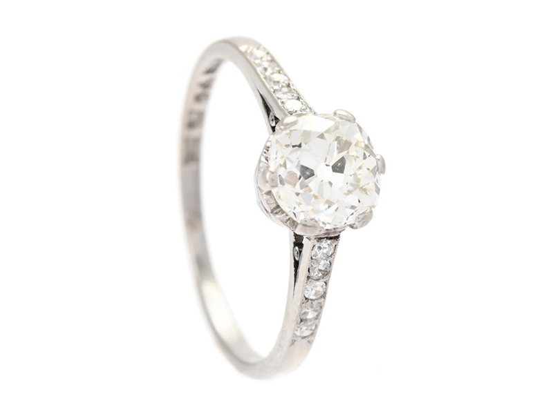 DAVID ANDERSEN & CO, ring, platinum, antique cut diamond approx. 1,20 ct, approx. Cr(J)/VS2, 10 single cut diamonds approx. 0,10 ctw, Stockholm 1928, size 18 mm, weight 3,0 g, center stone has small notches, a few side stones has notches and damages, case.