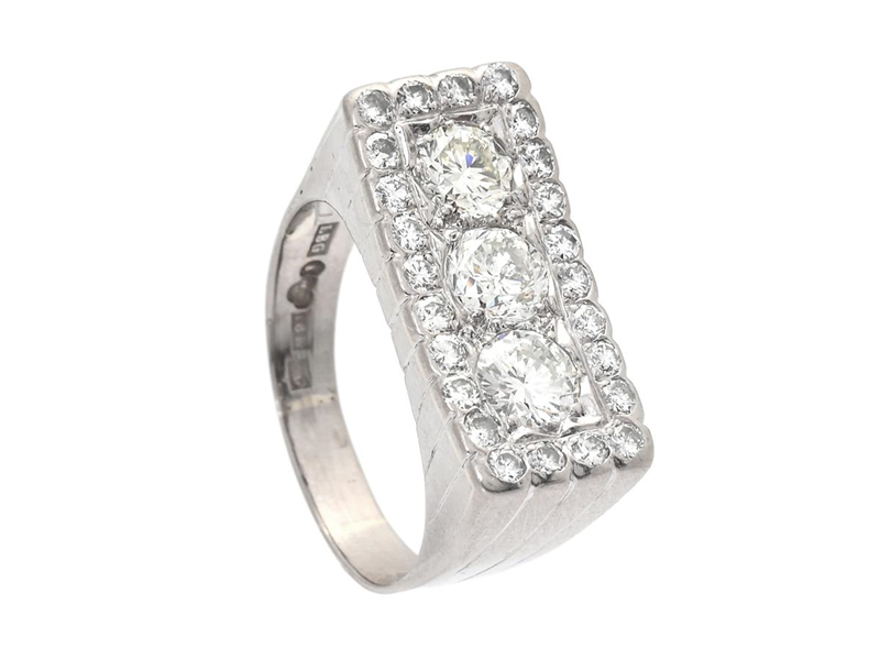 RING, 18K white gold, 27 brilliant- and old brilliant cut diamonds approx. 2,35 ctw, approx. TW-Ca/VS-P, Leif A Bäckmans Guldsmedja, Stockholm 1966, size 20,25 mm, weight 11,6 g, some diamonds with notches, worn settings, altered ring size.