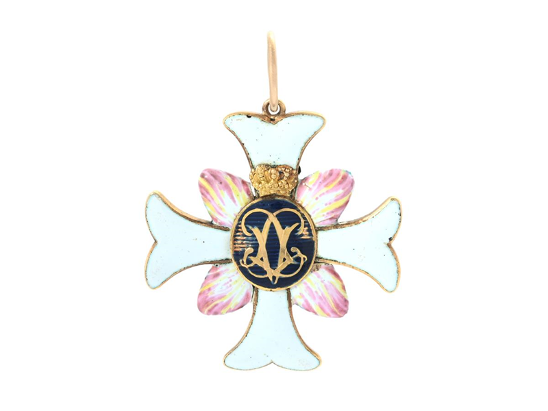 ORDENSTECKEN, Vadstena Adliga Jungfrustift, gold, enamel, queen Lovisa Ulrikas monogran in gold against blue bottom, 40x40 mm, weight 11,6 g, small damages on the enamel.