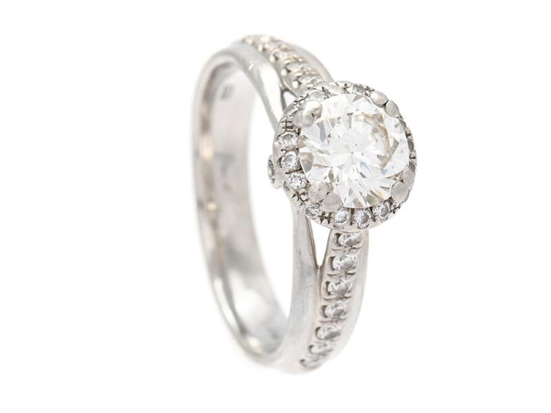RING, platinum, brilliant cut diamond approx. 1,00 ct, approx. W(H)/SI1, small brilliant cut diamonds approx. 0,50 ctw, size 17,5 mm, weight 7,1 g, engraved heart i the ring shank, weak settings at one part of the small diamonds.