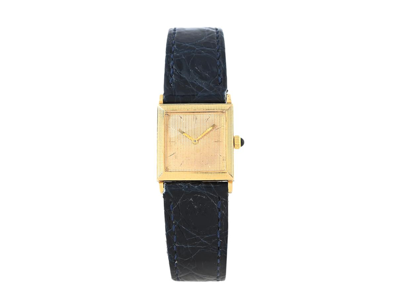 BOUCHERON, ladies´ wristwatch, 19,5 x 19,5 (25) mm, Cal 620 (Omega), Serial no. 21764737, Case no. 14420, 18K gold, manual winding, plastic crystal, leather strap, original buckle in 18K gold, approx. 1964, case.