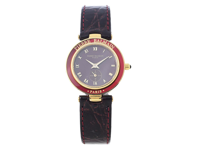 PIERRE BALMAIN, Paris, ladies´ wristwatch, 26 mm, Case no. 178.1170 H.3, gold plated, quartz, sapphire crystal, small seconds hand, integrated leather strap, gold plated original buckle, approx. 1990.