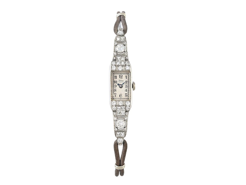 NITON, Genève, ladies´ wristwatch, 10 x 43 mm, Case no. 71861, platinum, manual winding, mineral crystal, damaged dial, barrel shaped movement, diamonds on case (38 pcs. TW-TCr (F-I)/WS-P, approx. 1,0 ctw), leather strap, buckle in 18K white gold, approx. 1935.