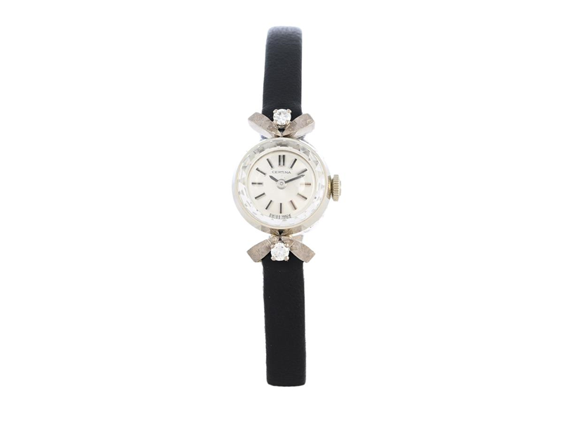 CERTINA, ladies´ wristwatch, 15 mm, Cal 13-50, 18K white gold, manual winding, sapphire crystal, brilliant cut diamonds on the case (2 pcs. TW/VS, approx. 0,14 ctw), leather strap, original steel buckle, approx. 1965.