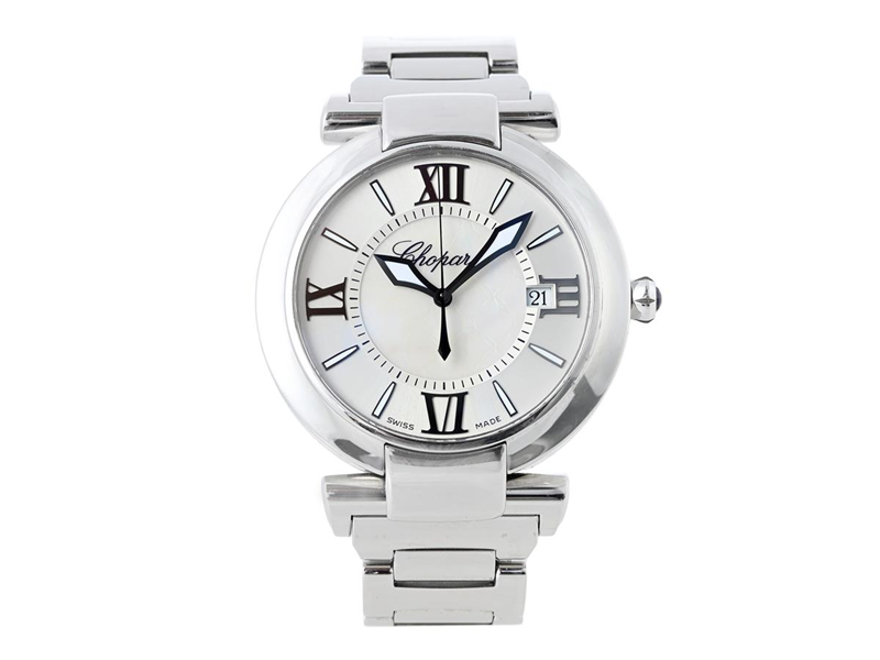 CHOPARD, Imperiale, Cal Sellita SW 300, Serial no. 1601452, Ref no. 388531-3003, Case no. 8531, ladies´ wristwatch, 40 mm, steel, self winding, sapphire crystal, mother-of-pearl-dial, damaged dial, crown with amethyst (0,15 ct), integrated original bracelet, folding clasp, approx. 2018, box, paper box.
