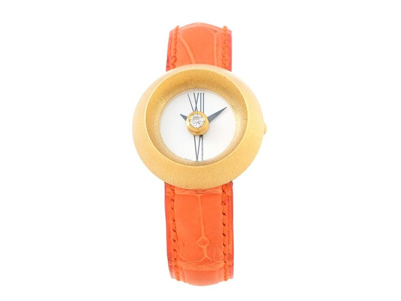 OLE LYNGGAARD, Copenhagen, Edition Luxe, Ref no. A1500-4009, Serial no. 1012, ladies´ wristwatch, 31 mm, 18K gold, quartz, sapphire crystal, brilliant cut diamond on dial (approx. TW/VS, 0,15 ct), leather strap, folding clasp in steel, approx. 2020.