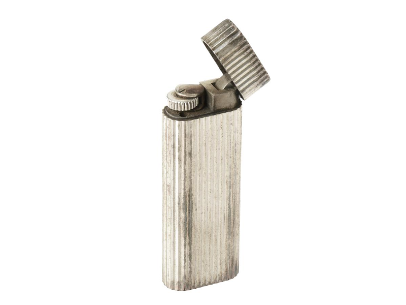 CARTIER, lighter, white metal, rifled, measurements 7,0 x 2,5 cm, case, certificate from year 1974, spare gas refill, oxidised.