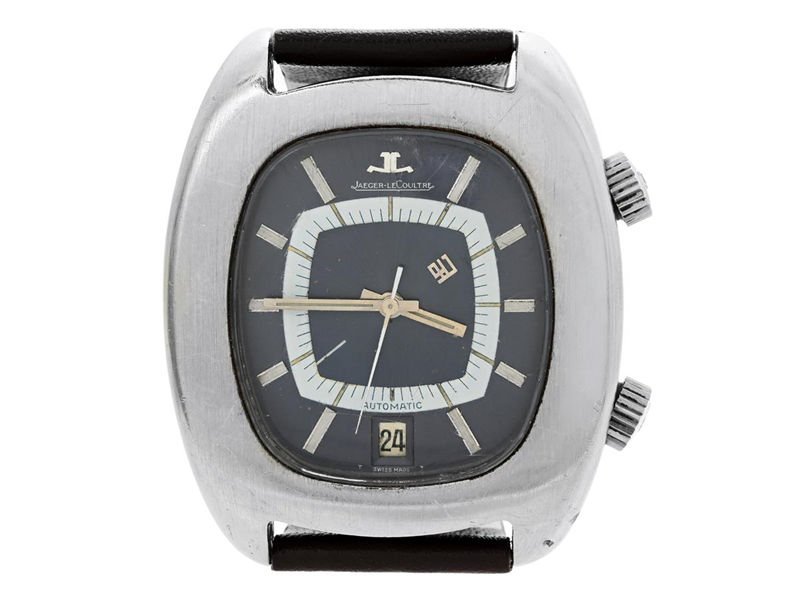 JAEGER-LE COULTRE, Memovox (T Swiss Made T), Cal 916, Serial no. 2088836, Ref no. E 872, Case no. 1265157, men´s wristwatch, 38,3 x 38 mm, steel, self winding, plastic crystal, date, alarm (defect), damaged dial, leather strap, approx. 1970.