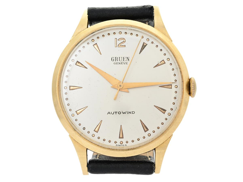 GRUEN, Genève, "Autowind", Cal 462 SS, Case no. 423 / 125303, men´s wristwatch, 33 mm, 18K gold, bumper automatic, plastic crystal, defect (needs overhaul), leather strap, approx. 1950.