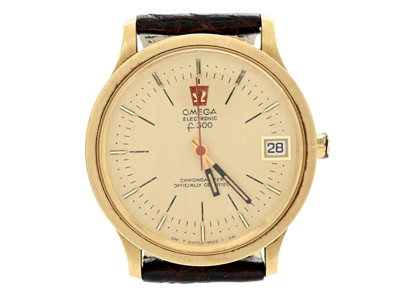 OMEGA, Constellation, Electronic (f 300, OF T Swiss Made T OM), Chronometer, Cal 1250 (ESA 9162), Serial no. 32011974, Ref no. BA 198.003, Case no. 198.003, men´s wristwatch, 35 mm, 18K gold, tuning fork, plastic crystal, date, gold dial, leather strap, approx. 1970.