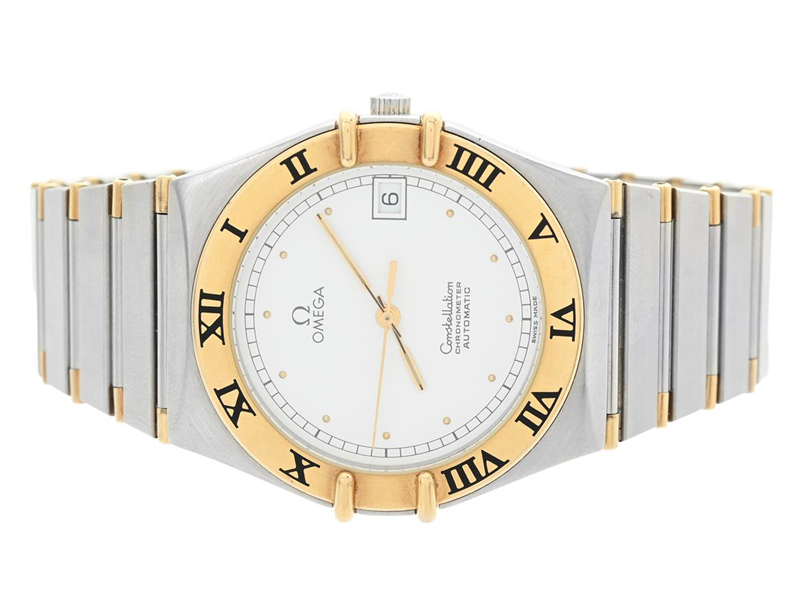 OMEGA, Constellation, Chronometer, Cal 1111 (ETA 2892-2), Movement no. 49542445, Serial no. 49542445, Ref no. DE 368.1075, Case no. 368.1075, men´s wristwatch, 35 mm, steel/gold, self winding, sapphire crystal, date, display caseback, integrated original bracelet (half bar), folding clasp, Ref no. 1448.5/431, approx. 1986.