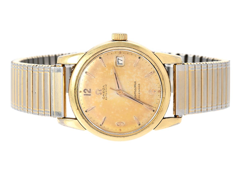 OMEGA, Seamaster, Calendar, Cal 503, Serial no. 14894574, Ref no. KO 2849, Case no. 2849-1 SC, men´s wristwatch, 34 mm, gold on steel (damaged), self winding, plastic crystal, date, damaged dial, approx. 1955, metal bracelet not original.
