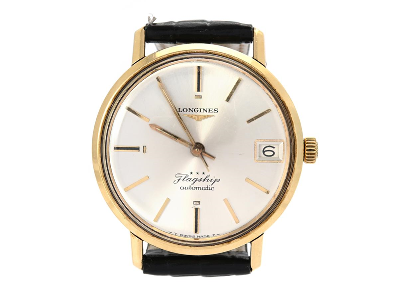 LONGINES, Flagship (-T Swiss Made T-), Cal 345, Serial no. 13664247, Case no. 3318-6 / 409, men´s wristwatch, 35 mm, gold on steel, self winding, plastic crystal, date, damaged dial, leather strap, approx. 1966.