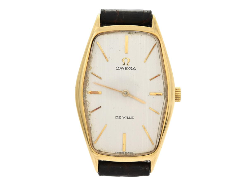 OMEGA, De Ville, Cal 620, Serial no. 31334117, Ref no. BA 111.096, Case no. 111.096, men´s wristwatch, 25 x 34,5 (40,5) mm, 18K gold, manual winding, plastic crystal, damaged dial, leather strap, approx. 1969, service case.