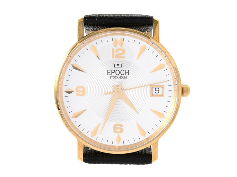 EPOCH, Stockholm, men´s wristwatch, 33,5 mm, 18K gold, quartz, sapphire crystal, date, engraving, leather strap, gold plated original buckle, approx. 2009.
