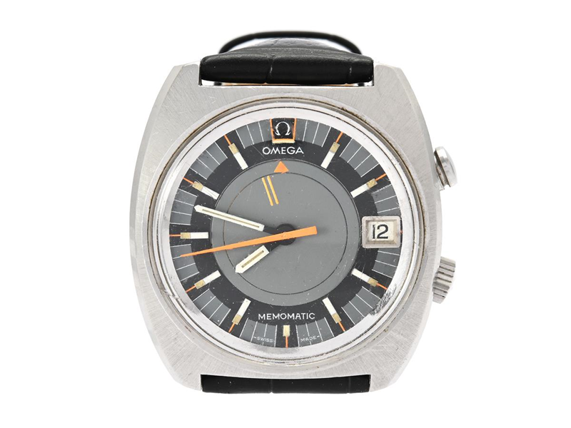 OMEGA, Seamaster, Memomatic (-Swiss Made-), Cal 980, Serial no. 31330945, Ref no. ST 166.0072, Case no. 166.072, men´s wristwatch, 39 x 50 mm, steel, self winding, plastic crystal, date, alarm, damaged dial, leather strap, approx. 1969.