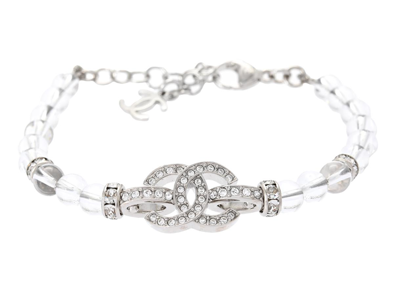 CHANEL, BRACELET, Charm bracelet, silver-tone, white stones, length 16-20 cm, original box. Very Good Condition.