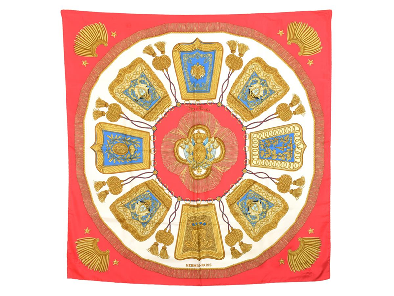 HERMÈS, SCARF, Poste et Cavalerie, Joachim Metz, 100% silk, 90x90 cm, multi-coloured, red, white, yellow, blue, original box. Excellent Condition.