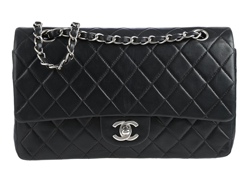 CHANEL, BAG, Medium Double Flap Bag, black quilted lambskin, silver-tone hardware, 25x15x6 cm, hologram-marked 6266665, year 2000-2002, certificate, faint scent. Good Condition.
