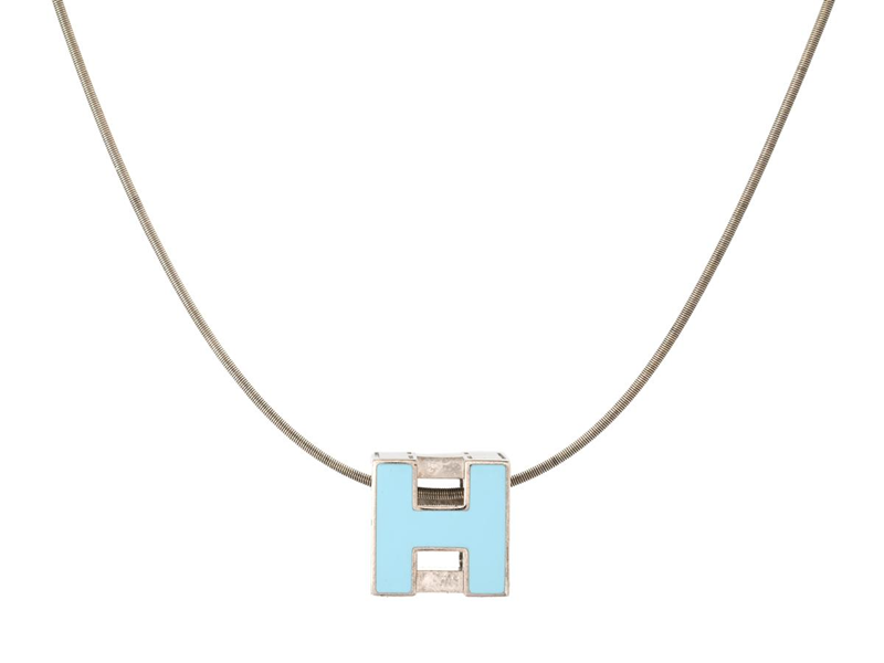 HERMÈS, NECKLACE, Enamel Cage D H Pendant Necklace, silver-tone metal, blue enamel, length 43 cm, width 1,1x1 cm, not original box. Good Condition.