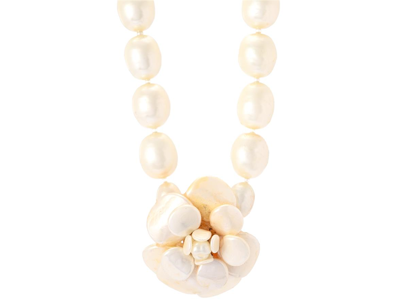 CHANEL, NECKLACE, Vintage, white imitation pearls, gold-tone metal, length 44-48 cm, width 5,5x5,5 cm, marked 97, P, year 1997, Made in France, original box. Good Condition.