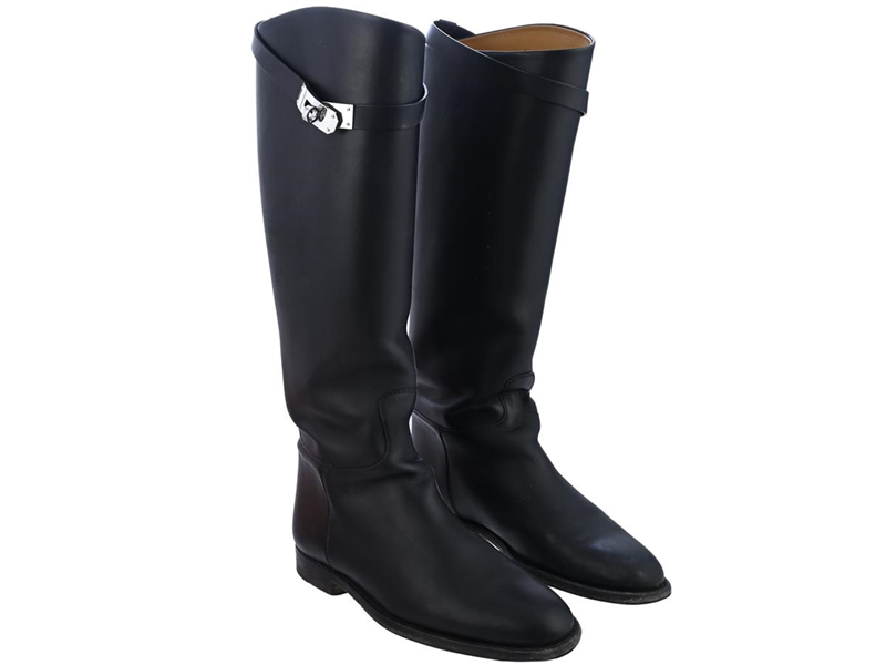 HERMÈS, SHOES, Jumping Boot, black leather, silver-tone hardware, size 37½, dustbag, original box, resoled, signs of wear on sole. Good Condition.