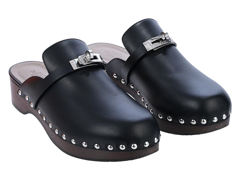 HERMÈS, SHOES, Carlotta Clog Mules, black calfskin, wood sole 4,5 cm, size 38, receipt copy from 2021, dustbag, original box. Good Condition.