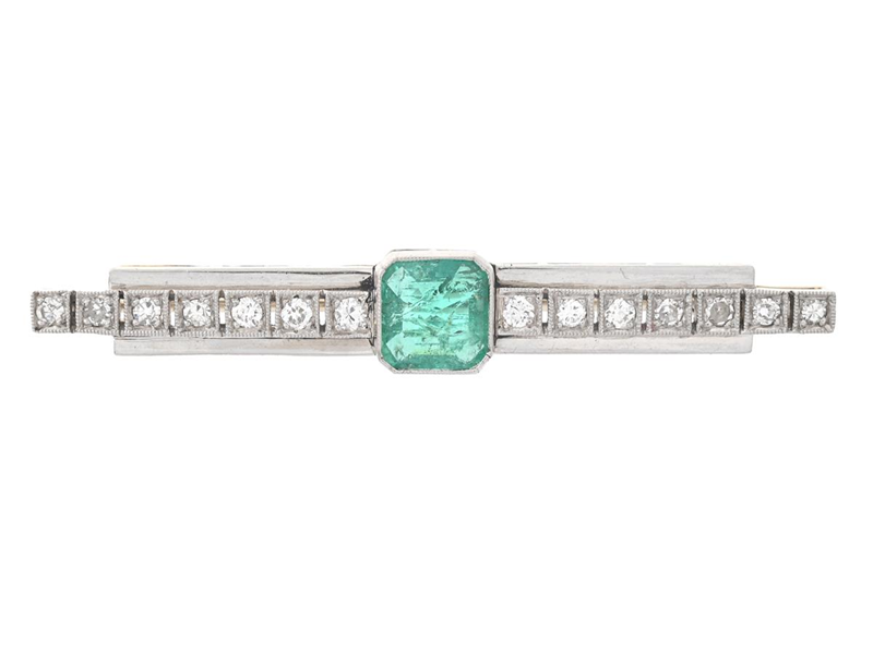 BROOCH, 18K white gold, emerald cut emerald approx. 0,70 ct, 14 brilliant cut diamond - and single cut diamonds approx. 0,28 ctw, C.G Hallberg, Stockholm 1935, length 44 cm, weight 4,4 g.