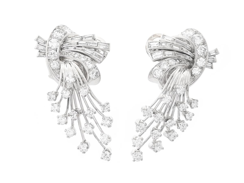 EARRINGS, 18K white gold/platinum, transitional-, brilliant- and baguette cut diamonds approx. 2,40 ctw, approx. R-TCr/VS, length 35 mm, weight 12,7 g, a few diamonds has notches and damages.