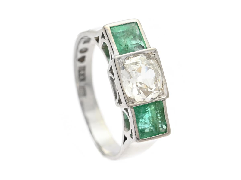 THREE STONE RING, 18K white gold, antique cut diamond approx. 0,90 ct, approx. W(H)/SI1, emeralds approx. 0,70 ctw, Erik Thomassons Guld-& Juvelfirma, Stockholm 1952, size approx. 18,5 mm, weight 5,7 g, altered ring size, the ring shank is somewhat oval, the diamond has indented naturals, the emeralds has notches and inclusions that reach the surface.