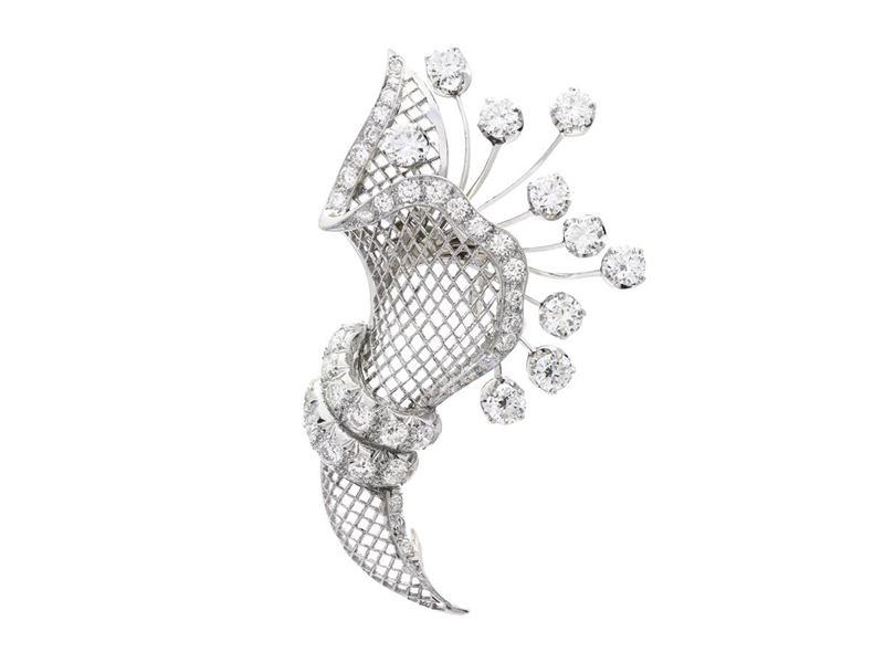 CLIP BROOCH/PENDANT, 18K white gold/platinum, brilliant cut diamonds approx. 4,20 ctw, approx. TW-Cr/VVS-P, mid 20th century, measurements 60x36 mm, weight 16,6 g, reworked pin, a few diamonds has notches and small damages.