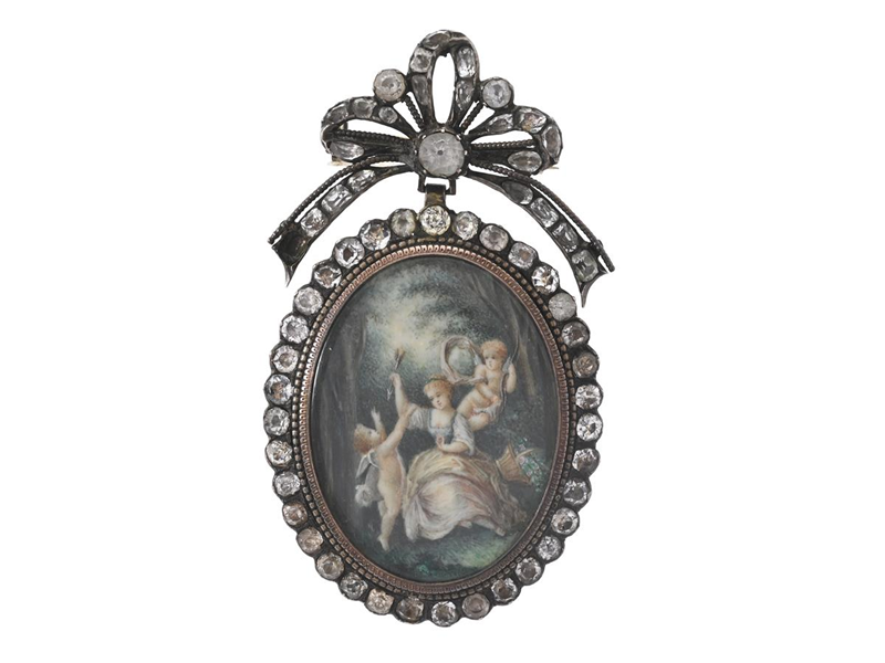 PENDANT, silver, painted portrait on bone, paste, antique, early 19th century, measurements 74x43 mm, weight 37 g, one stone missing.
