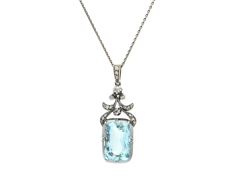 PENDANT WITH CHAIN, 14K gold/silver, cushion cut aquamarine approx. 7,00 ct, rose cut diamonds, marcasites, antique, height 3,5 cm, length 68 cm, weight 6,9 g.