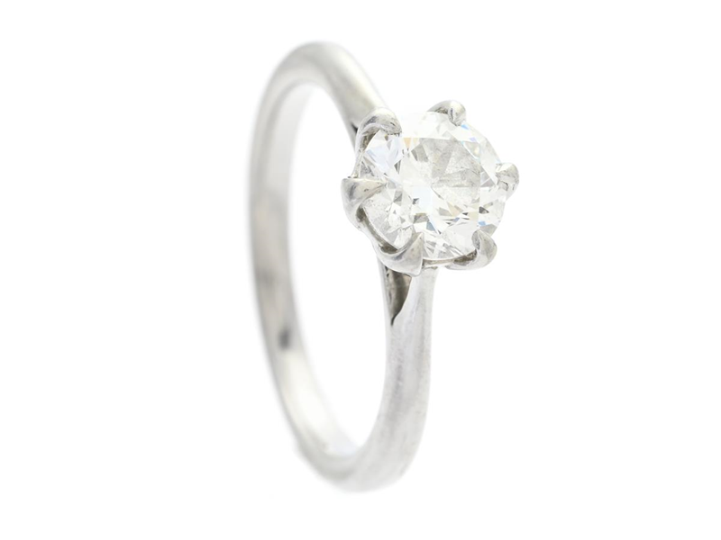 SOLITAIRE RING, platinum, brilliant cut diamond approx. 0,90 ct, approx. TW(F)/VS1, size 15,75 mm, weight 4,2 g, the diamond with thick girdle and naturals next to the girdle.