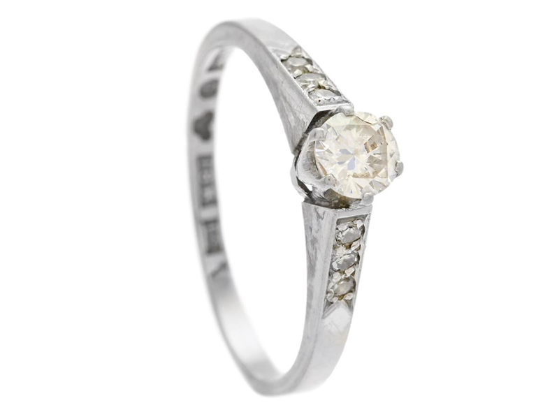 RING, 18K white gold, brilliant cut diamond approx. 0,20 ct, approx. TW(G)/VS, 6 single cut diamonds approx. 0,06 ctw, size 15,25 mm, weight 1,9 g, the larger diamond with tear on the crown and inclusions near surface.