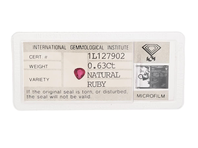 RUBY, pear shaped, 0,63 ct, measurements 5,2 x 5,0 x 2,8 mm, IGI certificate 1L127902, sealed.
