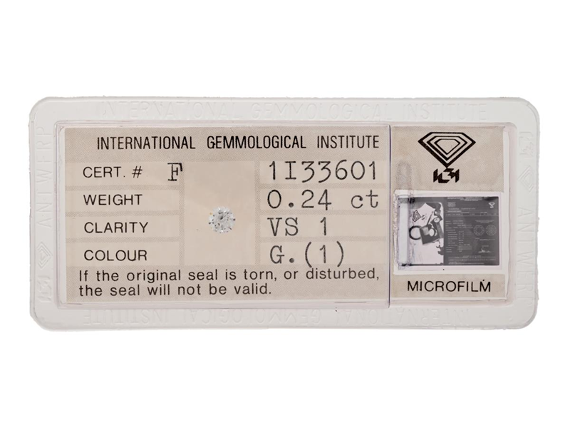 DIAMOND, brilliant cut, 0,24 ct, TW(G)/VS1, IGI certificate 1I33601, sealed.