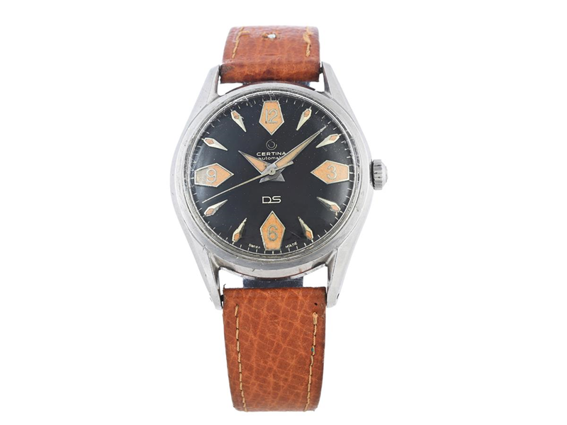 CERTINA, DS (Swiss Made), "Tropical Dial", "Patent Pending", Cal 25-45, Serial no. 3825549, Ref no. 5601.012, Case no. 5601.012 (HF), men´s wristwatch, 36 mm, steel (Staybrite), self winding, plastic crystal, defect (needs overhaul), leather strap, approx. 1960, box.