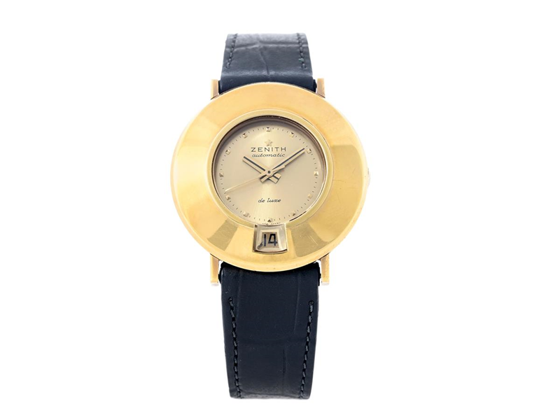 ZENITH, S.65, De Luxe, s.c. "Keyhole", Cal 2542 PC, Serial no. 6380293, Case no. 627A896, men´s wristwatch, 35,5 mm, 18K gold, self winding, plastic crystal, date, gold dial, leather strap, approx. 1967.