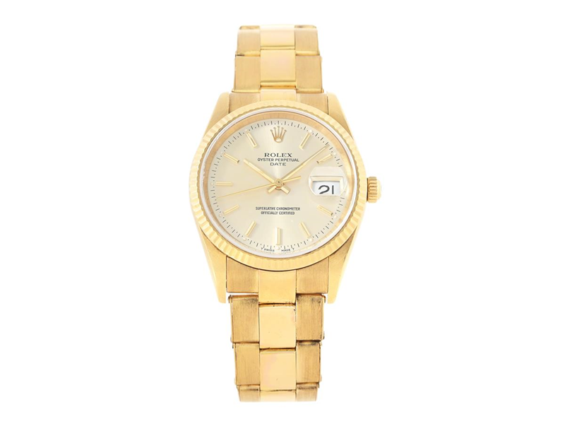 ROLEX, Oyster Perpetual, Date (T Swiss Made T), Chronometer, Ref no. 15238, Serial no. E625631, Cal 3135, Movement no. 5898827, Case no. 15200, men´s wristwatch, 35 mm, 18K gold, self winding, sapphire crystal (notches/scratches), date, Oyster bracelet (restored/Folded, no alteration), folding clasp, Ref no. P6/57 B, total weight 112,7 grams, approx. 1991.