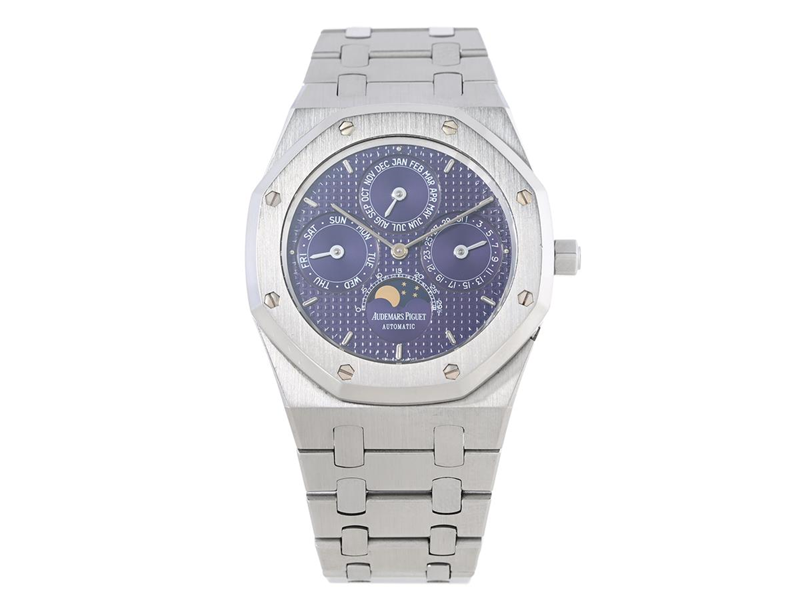 AUDEMARS PIGUET, Royal Oak, Quanteme Perpetual Automatic, Cal 2120/2800, Ser no. 286378, Ref no. 25654ST.00.0944ST.01, Case no. C-28302-222, men´s wristwatch, 39 mm, steel, self winding, sapph crystal, perpetual calendar (day, date, month, moonphase), replaced dial (later/blue), original bracelet, folding clasp (replaced/later), "Extrait the Registre", 20 Sep 1988, box (not contemp), paper box.