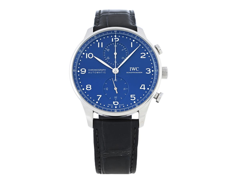 IWC, Schaffhausen, Portugieser, "150 Years", Cal 69355, Serial no. 4496630, Ref no. 371601, Case no. 6144304, chronograph, men´s wristwatch, 41 mm, steel, self winding, sapphire crystal, display caseback, leather strap, folding clasp, certificate (not complete), approx. February 2019, box, paper box (damaged). Limited but not numbered (One of 2000.)