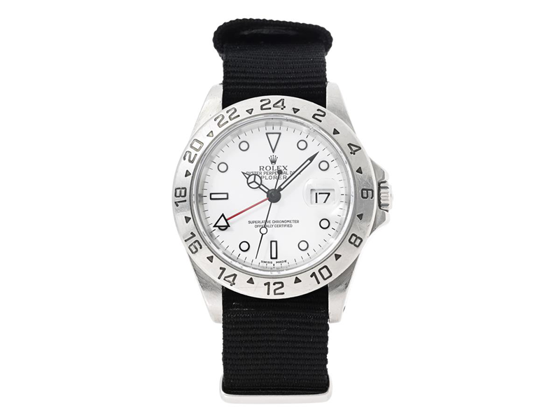 ROLEX, Oyster Perpetual Date, Explorer II (Swiss Made), Chronometer, Ref no. 16570, Serial no. K135616, Cal 3185, Movement no. 3 8957759, Case no. 2180, men´s wristwatch, 40 mm, steel, self winding, sapphire crystal (notch), date, 24h-display, NATO-strap, certificate, October 2001, box, paper box.
